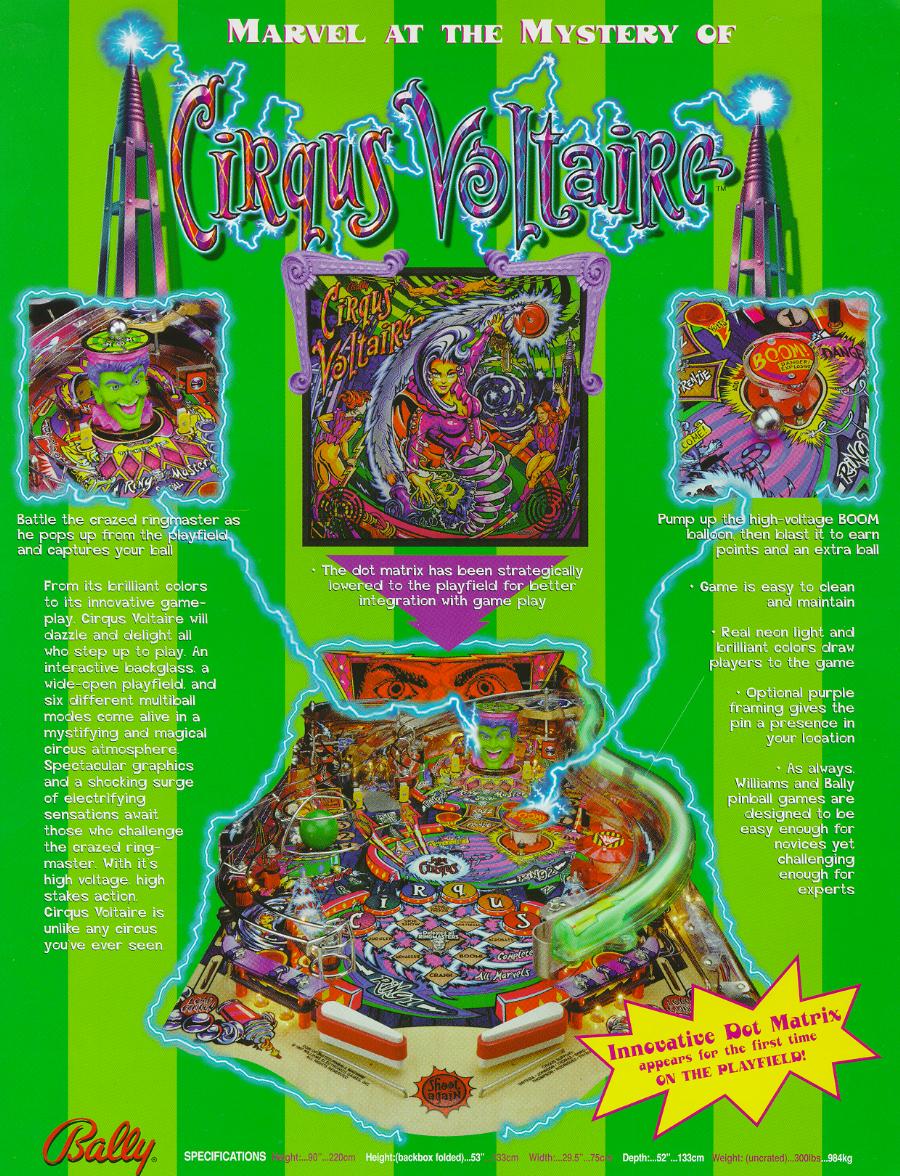 Neon lights, brilliant colors and an interactive backglass draw players to the game and the innovative gameplay and spectacular graphics capture them in a mystical circus atmosphere. With a wide open playfield, easy to understand rules for beginners, a large number of play modes and challenging multiballs for pinball magicians, Cirqus Voltaire has something for everyone.