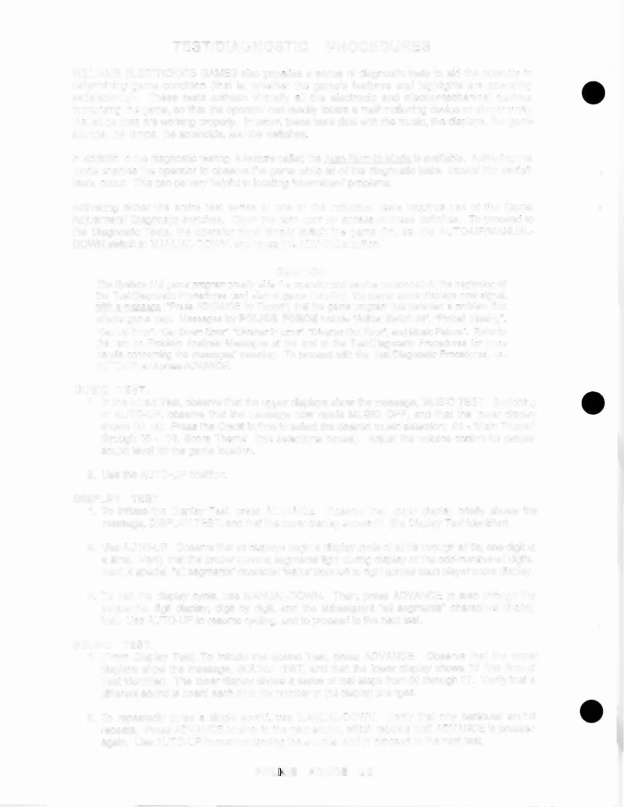 WILLIAMS ELECTRONICS GAMES also provides a series of diagnostic tests to aid the operator in